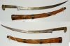 Langer Flyssadolch oder eher ein kurzer Säbel. Klingenlänge 40,1cm, Gesamtlänge 50,9cm, starke Klinge mit keilförmigem Querschnitt, Klingenrücken 1,05 cm, Klinge beidseitig und Klingenrücken mit Messingeinlagen verziert, auf dem Griffrücken befindet sich eine Gravur, die ich als Signatur vermute, die Holzscheide wie bei diesen Waffen üblich ist reich beschnitzt, guter Zustand