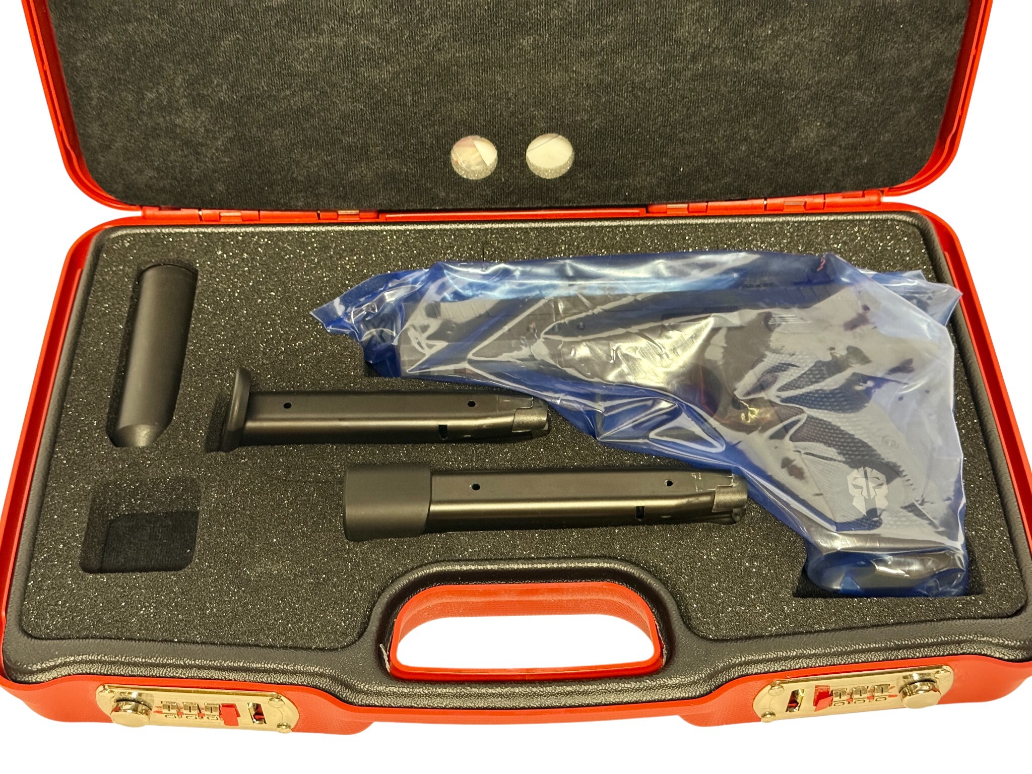 Im Lieferumfang ist der abgebildete Koffer, sowie zwei Magazine, davon eins mit 17 Schuss und eins mit dem +3 Extra Alu-Magazinboden also 20 Schuss, die Bedienungsanleitung, die Multi-Dot-Platte und sämtliche Montageplatten für alle gängigen Rotpunkte enthalten (UVP des Plattensets sind 99€).