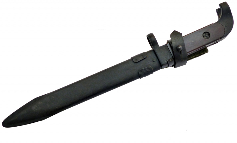 Bulgarisches Bajonett für AK 47. Mit Webbing-Koppelschlaufe & Leder-Sicherungsriemen. Nicht passend für AKM, AK 74 und alle AK-Modelle mit Bajonetthaft.
