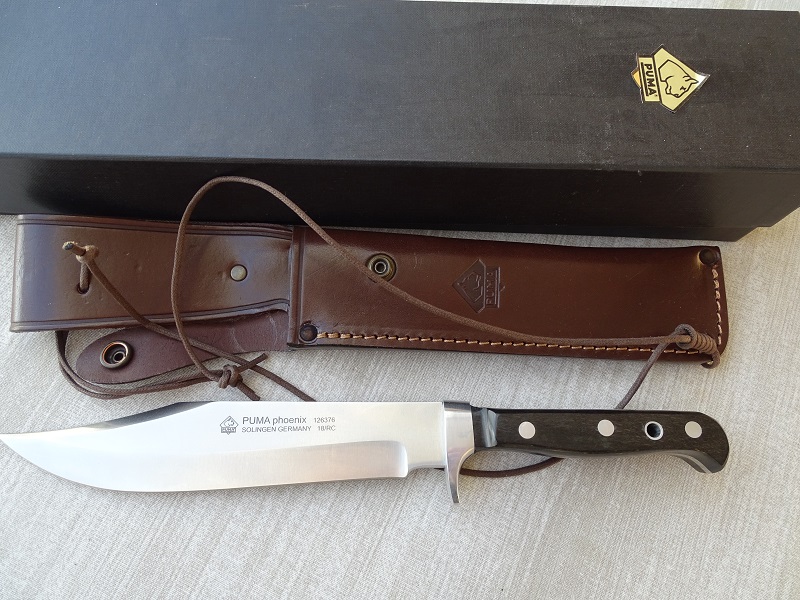 Puma Messer Phoenix 126376 mit Pakka -Holz Griffschalen. Unbenützter Neuzustand. Mit Lederscheide und Originalkarton. Gesamtlänge 327 mm, Klinge 200 mm, Stahl 1.4116--55-57 HRC, Scheide in Sattelleder. Fragen per e-mail- keine Garantie und Rücknahme-----------z.Z. 298 Euro.----Bei Sofortkauf kostenloser Versand.---