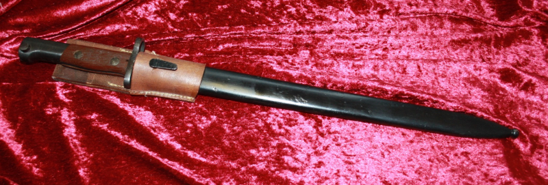 Der Bajonettdrücker funktioniert einwandfrei. Gesamtlänge 514 mm. Klingenlänge 383 mm. Insgesamt guter Zustand mit leichten Gebrauchsspuren. Scheide und Bajonett sind nicht nummeriert.