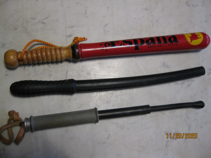 3x Schlagstöcke. Spanischer Holzknüppel 45cm lang. Polizei Gummi-Schlagstock. NVA-Vopo Teleskop-Schlagstock. Gebrauchtware, keine Garantie, kein Umtausch.