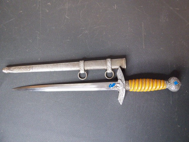 Aus meiner Sammlung gebe ich, ein alten Luftwaffen Dolch Hersteller WKC SOLINGEN mit Scheide ab. Gelblicher Griff 100% Original, mit gedrillter Aluminium Draht Wicklung. Gefäßteile Aluminium. Zweischneidige Klinge auf der Fehlschärfe, Hersteller WKC SOLINGEN. Scheide Magnetisch mit zwei Trageringe. Das Stück ist im Guten Sammelwürdigen Zustand. Alles andere entnehmen Sie Bitte den Fotos. Kann zu jederzeit bei mir besichtigt werden. Privatauktion keine Rücknahme und Garantie.