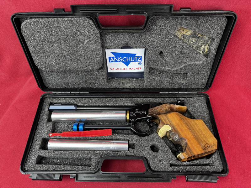 Es handelt sich hier um eine Anschütz Luftpistole M 10, Kaliber: 4,5mm selbstverständlich mit F im Fünfeck. Wir haben die Pistole getestet und durchgesehen und Sie hat einwandfrei die 50 Stück von uns verschossenen Diabolos sehr präziese Ziel gebracht.