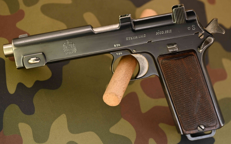Beschriftung: „STEYR 1912“, „Mod. 1911“, Seriennummer „924“, diverse alte gültige österreichische Beschusszeichen. Links auf dem Schlitten großes chilenisches Staatswappen, rechts Eigentumsstempel "EJERCITO DE CHILE" (= chilenisches Militär). Gültige bundesrepublikanische Beschusszeichen "Adler über N".