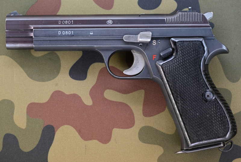 Markenlogo „SIG“ im Oval und Seriennummer "D0801" links auf dem Schlitten, gültiges Beschusszeichen "Adler über BMDI 1" (= Bundesministerium des Inneren), Seriennummer "D0801", „S“ und „F“ links auf dem Griffstück, Bundesadler über gültigem BMI-Beschusszeichen.