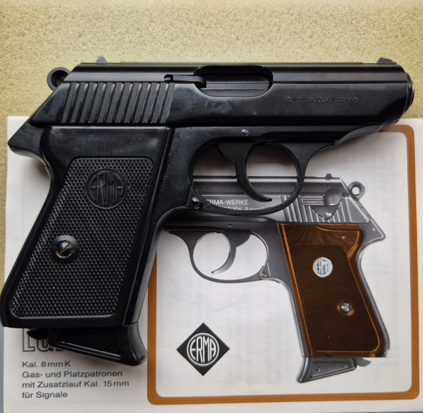 ERMA EGP 75S Schreckschuss Pistole im Kal. 8mmK mit PTB 401, Beschussjahr 90. Lieferumfang siehe Bilder (inkl. Original Verpackung). Zustand der Waffe: neuwertig. Für den Kauf wird ein Altersnachweis benötigt.
