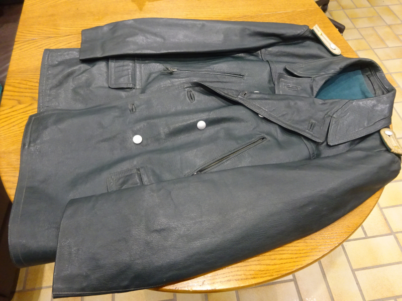 sehr gut erhaltene Polizei-Leder-Jacke grün schwere Ausführung,