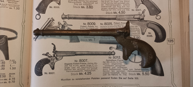 Massiver Messing abguss einer Flobert-Salon Pistole wie sie im Stukenbrok Katalog von 1911 beschrieben wird. Habe ich so noch nie Gesehen, und gehe von unikaten aus ( es existiert noch eine). Die Pistole hat keine bewegliche Teile und auch keine Laufbohrung, alles ist einfach nur aus einem Guss. Der Abguss zeigt das wohl ein Original als vorlage gedient hat. Privatverkauf keine Garantie oder Rücknahme.