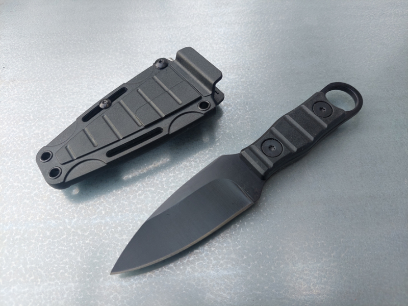 Sie bieten auf ein kleines Stiefelmesser (Boot Knife), das auch als Neckknife, also an einer Schnur um den Hals getragen werden kann. Die Klinge ist schwarz beschichtet. Der Griff besteht aus G10, die Scheide aus Kydex. Sie weist einen angeschraubten Stahlclip auf, mit dem sich das Messer gut am Hosenbund oder in der Jackentasche fixieren lässt. Schraubt man den Clip ab, kann man es gut an einer Schnur um den Hals tragen. Das Messer sitzt fest in der Scheide, sodass man es problemlos mit dem Griff nach unten hängend tragen kann.