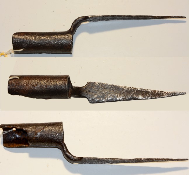 Kleines Tüllenbajonett, frühe Fertigung, 17. Jh., Innendurchmesser der Tülle 22-23 mm (nicht exakt rund), Tüllenlänge 85mm, flache Klinge 15cm, wahrscheinlich handgeschmiedet, offenbar war der hintere Teil der Tülle unten offen, dort die Kanten teils wellig, auch ansonsten starke Rostnarben
