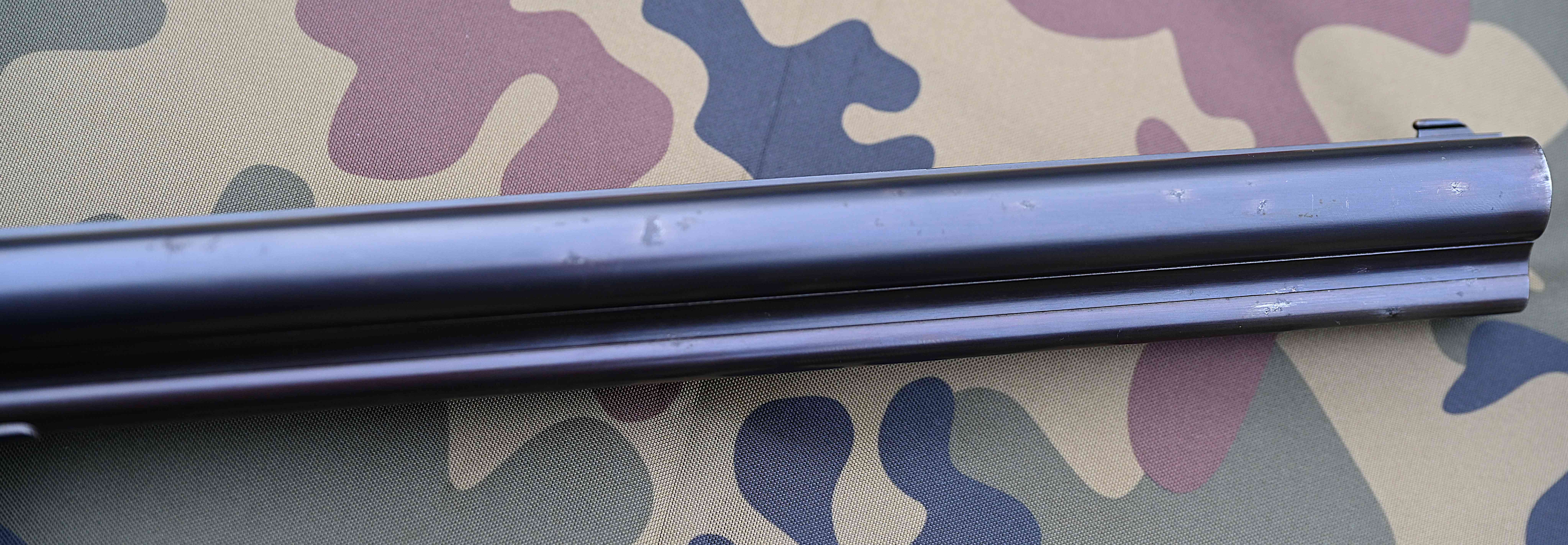 Läufe zu ca. 98 % mit tadelloser originaler mattschwarzer Brünierung, ansonsten hier und da auf der oberen Doppelllaufhälfte, hauptsächlich rechtsseitig leicht hellere Flecken, aber alles glatt und unverdellt.