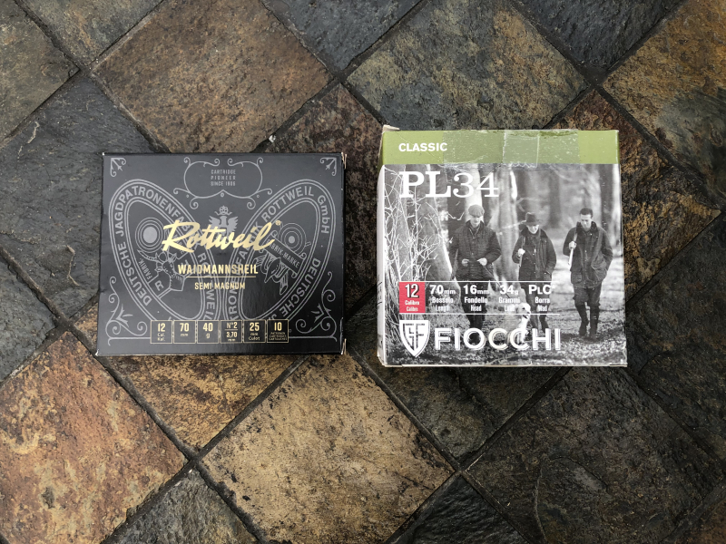 25 St. 12/70 FIOCCHI PL34 (2,9mm) und 10 St. 12/70 Rottweil Waidmannsheil Semi Mag. (3,7mm).