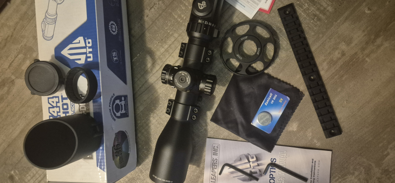 inkl. 22 mm Weavermontage und UTG Montage-Adapter für 11 mm Prismenschiene, Beschreibung und CR2032 Batterien.