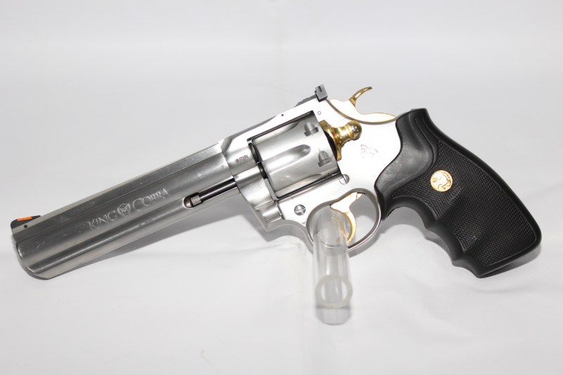 Hingucker! Revolver Colt Mod. King Cobra in 6inch im Kal. .357 Magnum. Ausführung Stainless mit goldfarbenen Bedienelementen. Timing sehr gut. Allgemeiner Zustand noch sehr gut mit leichten Gebrauchsspuren (oberflächlich im Stainless Finish). Seltenes Stück! Beschuß "KB" (1991) . Gebrauchtware (Differenzbesteuert) - Gewährleistung auf ein Jahr verkürzt gem. Paragraph 476 Abs.2 BGB. AGBs sind Bestandteil des Kaufvertrags. Versand (ausschließlich per Spedition eigenhändig - auch an andere Händler - für 40.- EUR Versandkostenanteil) zahlt Käufer, Abholung möglich. International bidders are welcom if they have a german dealer partner who will take the gun for export.