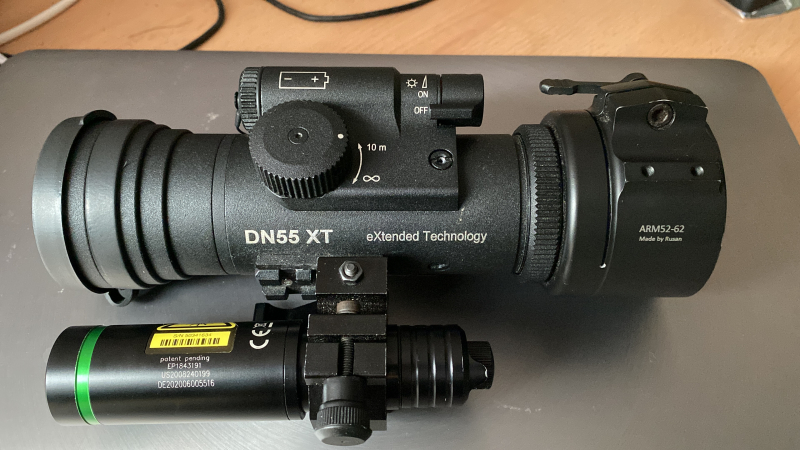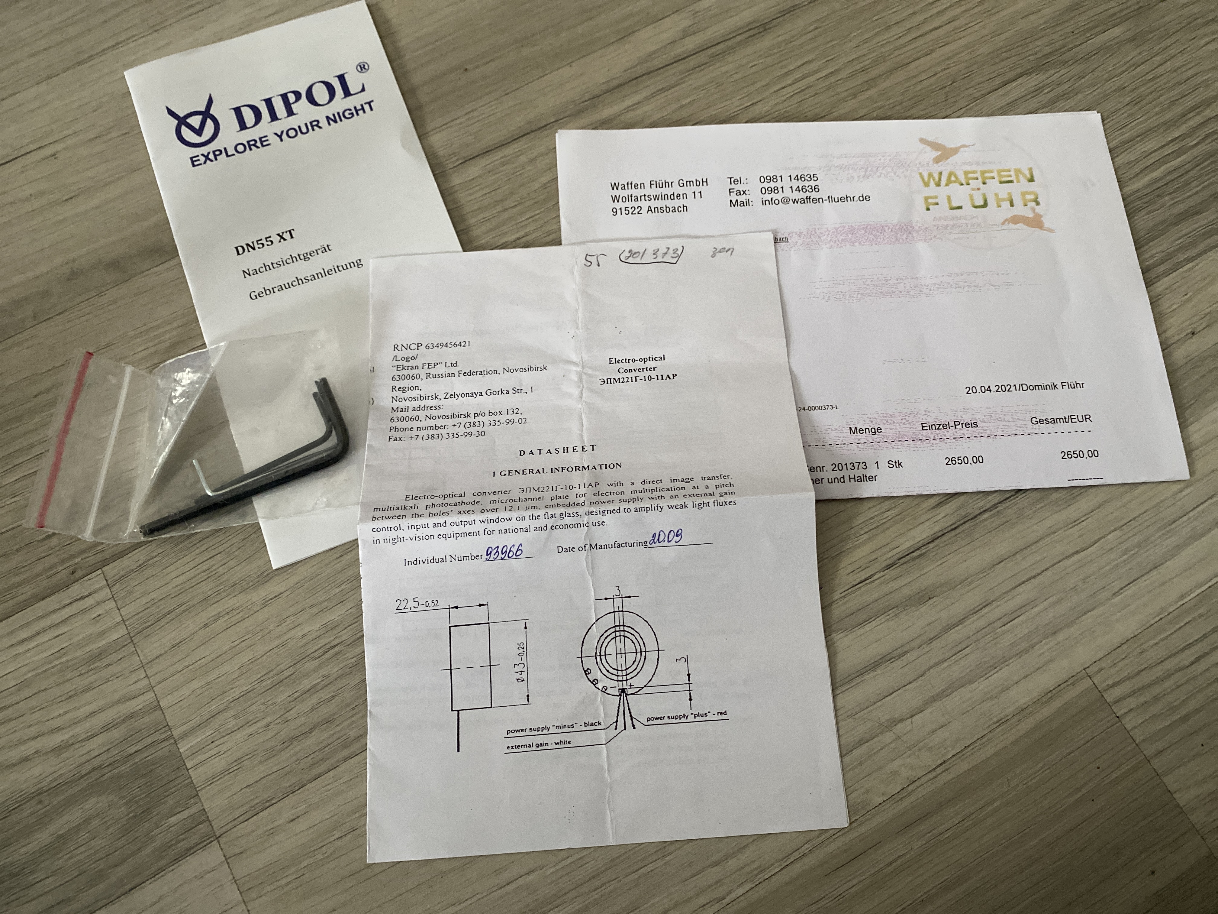Batterien lege ich einen Satz mit dazu. Der Rusan Adapter passt für ein Glas mit 56er Objektiv. Bei mir auf einem Zeiss 3-12 x 56. Die Originalbedienungssnleitung, das Datenblatt und die benötigten Inbusschlüssel sind natürlich vorhanden und werden mitgeschickt