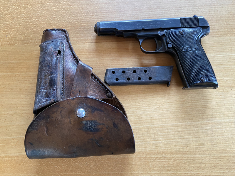 Zum Verkauf steht im Auftrag eines Waffensammlers eine MAB D Wehrmachtspistole mit originalem Holster und Ersatzmagazin.