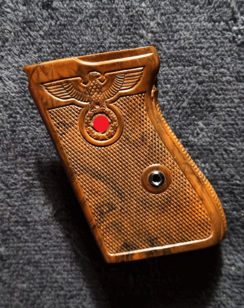 Sie bieten hier auf eine schöne einteilige Griffschale für die Pistole Walther PPK aus WK2 Zella mehlis, mit Stahlanlage an die Innenseite. Sehr schönes Sammleranfertigung Stück!