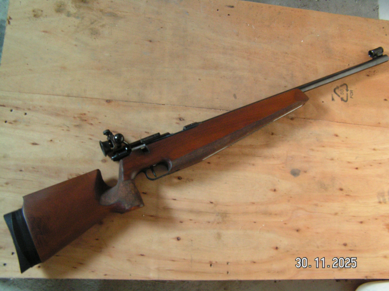 Aus Vereinsbestand biete ich hier im Auftrag eine KK-Matchbüchse von Anschütz Modell Match 54 an. Der 22mm starke Lauf wurde 1979 beschossen und verfügt über ein X-Stempelung. Die Brünierung ist vollständig. Es ist bereits der verbesserte Abzug verbaut mit gekrümmten Verschlußhebel. Die Visierung ist vorhanden. Der Diopter hat eine verlängerte Halteschiene, ist aber etwas schwergängig. Der Schaft weist nur geringe Gebrauchsspuren auf.