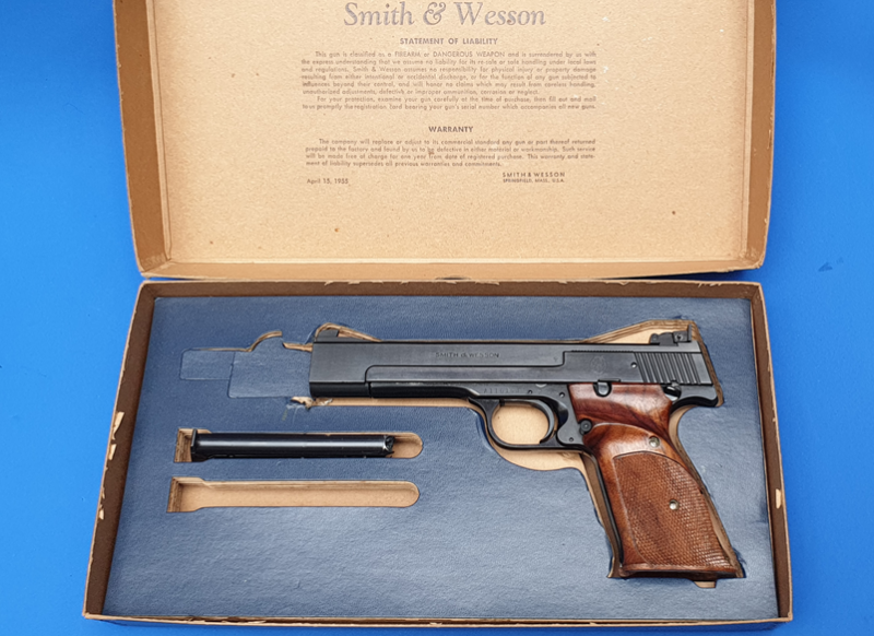 Angeboten wird eine Selbstladepistole von Smith & Wesson, Mod. 41 im Kal. .22lfB mit einem Magazin und der originalen Schachtel.