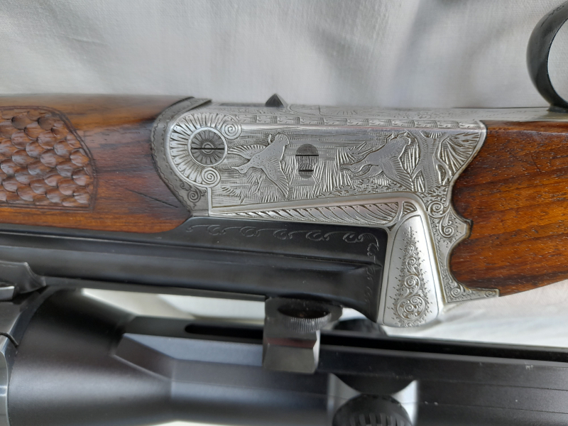 Technische Daten: Gesamtlänge ca. 102 cm. Lauflänge ca. 60 cm. Hinterschaftlänge ca. 36 cm. Gewicht ohne Zielfernrohr nur 2.850 Gramm, mit Zielfernrohr 3540 Gramm. Vorderer Abzug mit Rückstecher, separater Auszieher für große Kugel. Schaft mit Schuppenfischhaut, geschlossene WEGU Elastik Schaftkappe. Leichtmetallsystemkasten. Umschaltung auf dem Kolbenhals, seitliche Greener Sicherung. ZF Diavari VM 2,5-10x50 T* mit Leuchtkreuzabsehen 4 in absolut fester wiederholgenauer SEM., Gewicht 690 Gramm.