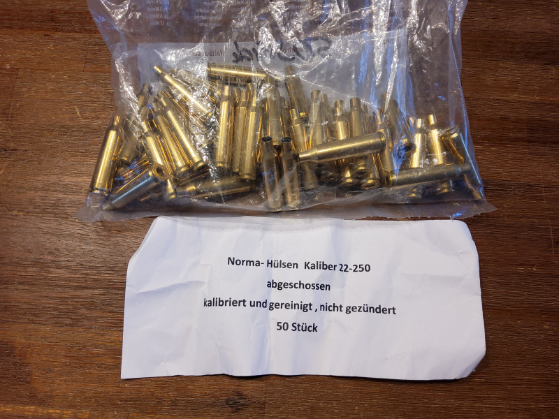 Zum Verkauf kommen 50 Hülsen von Norma im Kaliber. 22-250 Remington. Die Hülsen sind gewaschen und kalibriert.