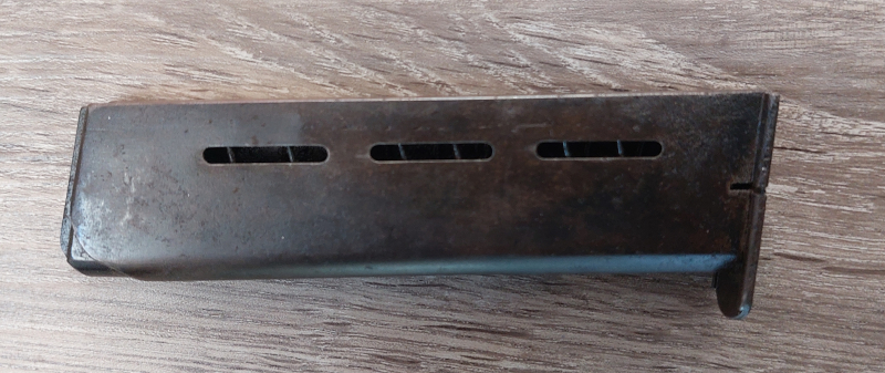 Biete ein Magazin aus der Zeit des 1. Weltkrieges von einer Mauser Modell 1914 im Kaliber 7,65 mm. Das Magazin wurde in dem in weiterer Auktion angebotenen Holster aufgefunden. Die Feder im Magazin hat ordentlich Spannung und kann noch verwendet werden. Auf dem Magazinboden befindet sich eine Seriennummer und seitlich eine Abnahmepunze.