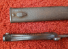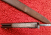 Gereinigter Speicherfund. Reinigungsspuren an der Klinge und dem Griff. Kleines Rostloch unten an der Scheide. Drücker ist gängig.