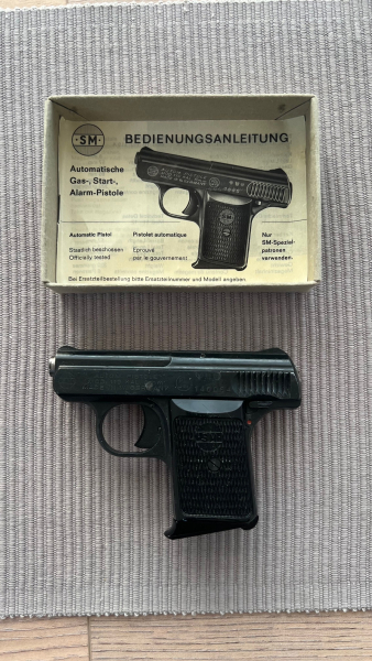 Zur Auktion steht hier eine Rhöner SM Mod. 110 Taschenpistole im starken Kaliber 8mm mit nummerngleicher OVP und originaler Bedienungsanleitung. Der Lauf ist aus Stahl gefertigt. Mündungsgewinde ist keines vorhanden. Minimale Laufsperre (siehe Bild). Der Ausschuss ist nach vorn aus dem Lauf heraus. Die Pistole hat keinerlei Schwächungen. Magazinkapazität 5 Schuss. Diese Waffe wurde baugleich als scharfe Variante im Kaliber 6,35 mm Browning hergestellt. Eine Trockenfunktion wurde durchgeführt, alles in Ordnung. Es sind keinerlei technische Mängel bekannt. Beschussjahr 1972.