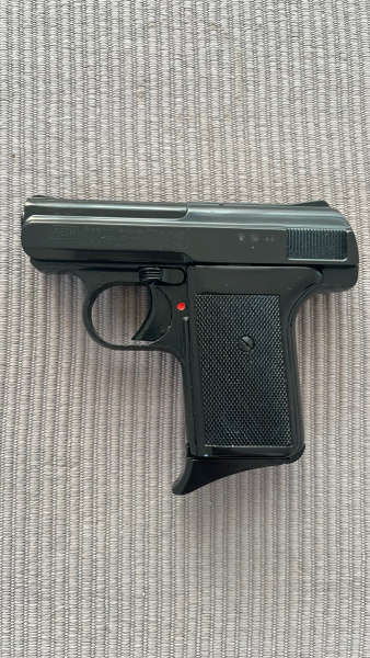 Zur Auktion steht hier eine Reck P6s Taschenpistole im starken Kaliber 8mm. Das S in der Modellbezeichnung steht für Signal, da diese Pistole über ein Mündungsgewinde zum Anbringen eines Signalbechers verfügt. Der Ausschuss ist nach vorn aus dem Lauf heraus. Die Pistole hat keinerlei Schwächungen. Diese Waffe wurde baugleich als scharfe Variante im Kaliber 6,35 mm Browning hergestellt. Magazinkapazität 7 Schuss. Eine Trockenfunktion wurde durchgeführt, alles in Ordnung. Es sind keinerlei technische Mängel bekannt. Beschussjahr 1983.