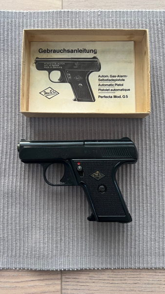 Zur Auktion steht hier eine schöne MaRie Perfecta Mod. G5 Taschenpistole im starken Kaliber 8mm mit OVP und originaler Gebrauchsanleitung. Der Lauf ist aus Stahl gefertigt. Ausschuss ist nach vorn aus dem Lauf heraus. Die Pistole hat keinerlei Schwächungen. Die Magazinkapazität beträgt 5 Schuss. Eine Trockenfunktion wurde durchgeführt, alles in Ordnung. Es sind keinerlei technische Mängel bekannt. Beschuss 1975.