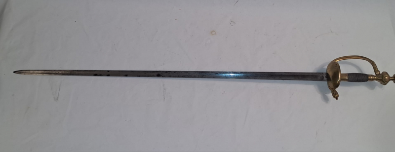 Infantrie - Offiziers - Degen (IOD) altes Modell Griff Messing gegossen und graviert, Parierstange mit festen Stichblättern. Hilze mit verzwirnter Drahtwicklung, gerade Klinge mit einseitiger Schärfe, breiter Kehlung und leicht gerundetem Rücken, Klinge auf ~30 cm beidseitig und auf dem Rücken geätzt mit Waffentrophäen und Ranken, auf der Fehlschärfe eindeutige Herstellermarke (bekröntes Wappen), Klinge L 82 cm, L gesamt 98,5 cm, Klinge flugrostig, sonst guter Zustand ab 1 €