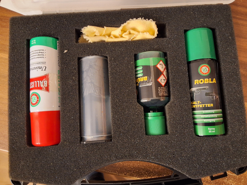 Gebrauchtes Set zum Schnellbrünieren von Ballistol in kleinem Koffer.