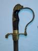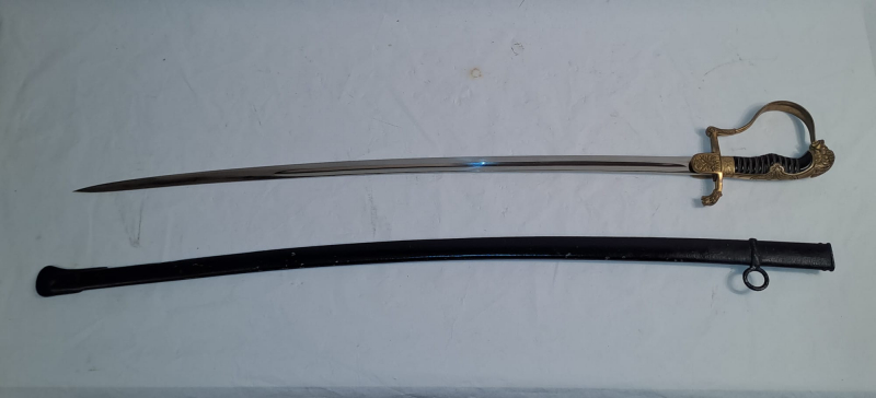 Löwenkopfsäbel für Offizier der preussischen Kavallerie Griff Messing gegossen ziseliert und vergoldet, das Messinggefäß im Stile der Säbel um 1840, Löwenkopfknauf mit breitem Bügel Parierstange mit Löwenkopf und gerundeten Parierlappen, terzseitig mit gekreuzten Säbeln, schwarze Hilze mit doppelt-gezwirnter Drahtwicklung , leicht gebogene Klinge mit einseitiger Schärfe breiter Kehlung und leicht gerundetem Rücken, auf der Fehlschärfe Herstellermarke Waage mit "ACS"), Klinge L76 cm, L gesamt 89,5 cm, originale geschwärzte Metallscheide mit Ringband, seitlicher Trageöse und Schleppblech, L gesamt 103 cm, Gewicht ges amt 1.060 gr., Alexander Coppel Solingen (ALCOSO) Ende 19. Jhd., guter Gesamtzustand mit nur geringen Alters- und Gebrauchsspuren, Vergoldung minimal berieben ab 1 €