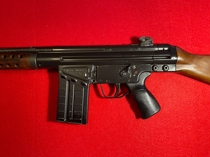 Heckler & Koch, Selbstladegewehr als zivile Version des G3 / Modell HK 41 aus Reservistenbestand, gültiger Beschuss, original Dioptervisierung. Das HK 41 wurde in geringen Stückzahlen (400 Stück) nur für Reservisten gefertigt. Geringe Gebrauchsspuren. Sicherung und Einzelfeuer Umschalter. Original Schaft aus Holz (sehr selten). Mündung original belassen, ohne Gewinde. Gebrauchtwaffe mit altersbedingten Abnutzungsspuren, Bilder sind Bestandteil des Angebots, Irrtum vorbehalten. Privatverkauf ohne Gewährleistung. Wenig geschossen, einwandfreie Funktion, aus Sammlung.