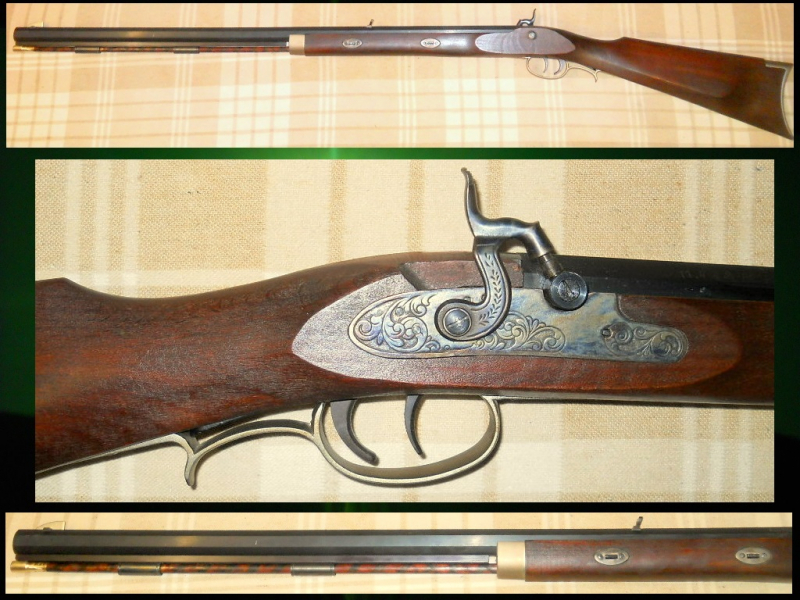 Artikelbeschreibung: ... Nachbau eines US Hawken-Rifle (lange Mountain-Version mit 2 Laufhaltekeilen) … hergestellt in Spanien von Dikar (bekannt für solide Qualität und gute Präzision) und natürlich mit gültigem Beschuss … die Waffe ist wohl nur wenig, evtl. sogar geschossen, gut gepflegt und hat nur geringe Gebrauchspuren … Technische Daten: Kal. .45, Länge ca. 122cm, Lauflänge ca. 81cm … der gezogene Achtkant-Lauf ist aushakbar und innen in prima Zustand … Piston ist nicht verschlagen … klassisches Visier … das floral gravierte Schloss arbeitet sauber in beiden Stellungen und ist buntgehärtet … der einstellbare Stecher funktioniert, ebenso wie der Normal-Abzug, tabellos … die Beschlagteile sind mattsilbern mit einem leichten gelbstich (Neusilber ???) ... der augenscheinlich rissfreie Schaft besitzt eine Backe ... der hölzerne Ladestock besitzt einen Messing-Dopper und ist mit einem klassischen Spiralband-Muster versehen ... den Gesamtzustand würde ich mit gut – sehrgut beschreiben … die Waffe wird evtl. mit demontiertem Lauf versendet