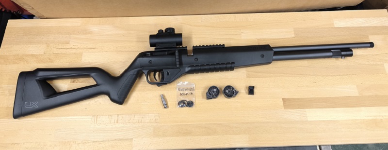 Umarex UX Iconix Pressluftgewehr 4,5 mm mit Reddot von 4komma5. Es wurden ca. 200 Schuss damit abgegeben. Das Iconix ist mit einer zweigeteilte Picatinnyschiene zur Montage einer Zieloptik integriert. Vorn am Lauf ist ein 1/2" UNF Gewinde zur Montage eines Schalldämpfers. Das Modell ist mit einem gezogenen Lauf und einer manuellen Sicherung ausgestattet. Zudem verfügt es über einen integrierten Stahl-Drucktank mit 100 cm³ Fassungsvermögen mit Manometer. Der Antrieb erfolgt über Pressluft. Das Trommelmagazin hat eine Kapazität von 10 Diabolos im Kaliber 4,5 mm. Im Lieferumfang sind ein Einzelschussadapter, 2 Trommelmagazine und ein Fülladapter enthalten.Fülldruck max. 137bar! Zum Füllen des Pressluftgewehrs benötigt man eine Pumpe, eine Pressluftflasche oder einen Kompressor.Versand 15.-€ per DHL versichertes Paket. Keine Garantie oder Rücknahme Achtung wichtiger Hinweis! Wegen den neuen Gesetzbestimmungen erfolgt der Verkauf unter Ausschluss jeglicher Gewährleistung, Garantie und Rücknahme. Da es sich um einen Privatverkauf handelt, kann ich keine Garantie nach neuem EU-Recht übernehmen. Der Käufer erklärt sich damit einverstanden und erkennt dies mit seinem Kauf an. Laut dem neuen EU-Recht muss dieser Zusatz unter jedem Online Verkauf stehen, ansonsten haftet der Verkäufer auch als Privatperson ein ganzes Jahr für die verkaufte Ware