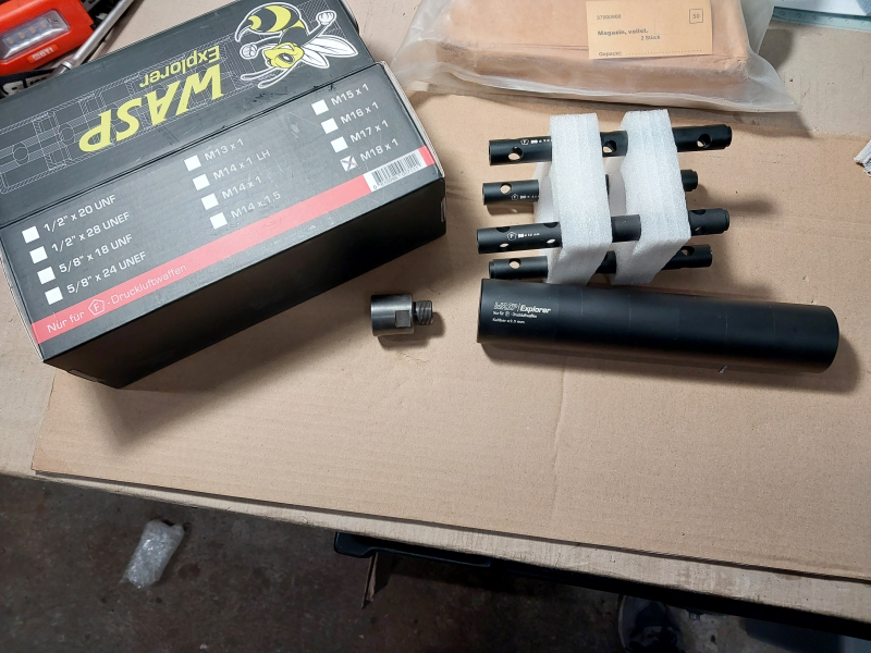 Verkaufe hier einen Schalldämpfer der für verschiedene Kaliber benutzt werden kann. Das Anschlussgewinde ist 18 x 1 und es gibt einen Adapter für die AK 74 oder baugleiche Modelle mit 21er Gewinde. Der Schalldämpfer ist neu und unbenutzt. Der Neupreis war 400 € plus 80 für den Adapter. Den Zustand entnehmen Sie bitte den Fotos