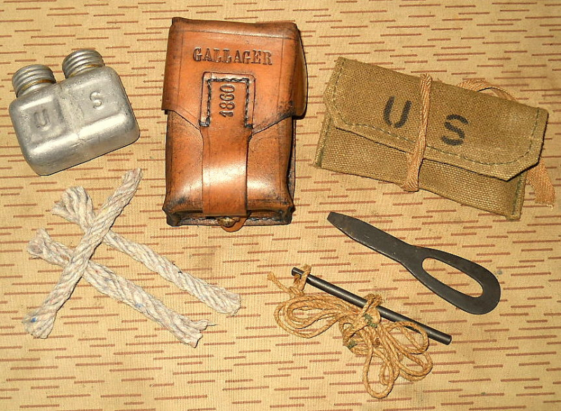 Artikelbeschreibung: ... Reenactment/Zubehör-Konvolut ... für ERMA/Wicho Perkussion-Hinterlader Gallager Mod. 1860 ... mit schöner, echt-ledener Gürteltasche, Putzzeugtasche (mit Inhalt) und 2-Kammer-Öler mit US