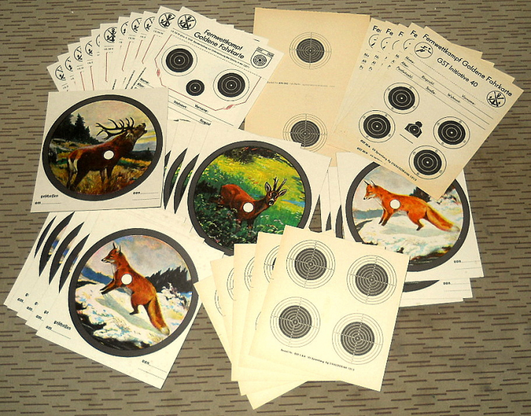 Artikelbeschreibung: ... über 35 Stk. original DDR/GST Luftgewehr-Schiessscheiben (7 verschiedene) .,.. guter Zustand ... Sie bekommen exakt das abgebildete Konvolut