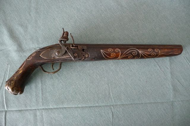 Watch out: No international shipping means no shipping to other countries as germany. No export. If you are highest bidder from other country as Germany you have to name a shipping address/ dealer in Germany. If you are bidding and no purchase is made, you have to pay the auction fees! Zum Verkauf kommt ein Modell einer verzierten Steinschlosspistole, nicht schussfähig. Solche Modelle wurden wohl früher als Andenken an Touristen verkauft im Morgenland. Man kann den Hahn nach hinten bewegen, dann bewegt er sich wieder nach vorn, aber er rastet nicht ein. Der Abzug ist ohne Funktion. Die Batterie ist fest. Reine Dekowaffe. Nach Ablauf der Auktion erhalten Sie meine Kontodaten über E-Post. Da dies ein Privatverkauf ist, kann ich weder Garantie noch Rückgaberecht einräumen. Versendet wird nur innerhalb Deutschland als versichertes Paket nach Zahlungseingang des Käufers. Zahlung bitte innerhalb von 14 Tagen, ansonsten gilt der geschlossene Kaufvertrag als aufgelöst. Versandkosten von 7,70 € trägt der Käufer. Verkauf nur an Personen über 18 Jahre, Altersnachweis (Kopie Personalausweis) per Ablichtung, E-Post oder Post erbeten. Bei ID Mitgliedschaft erübrigt sich natürlich der Altersnachweis. Bieten Sie bitte nicht, wenn Sie mit diesen Bedingungen nicht einverstanden sind.