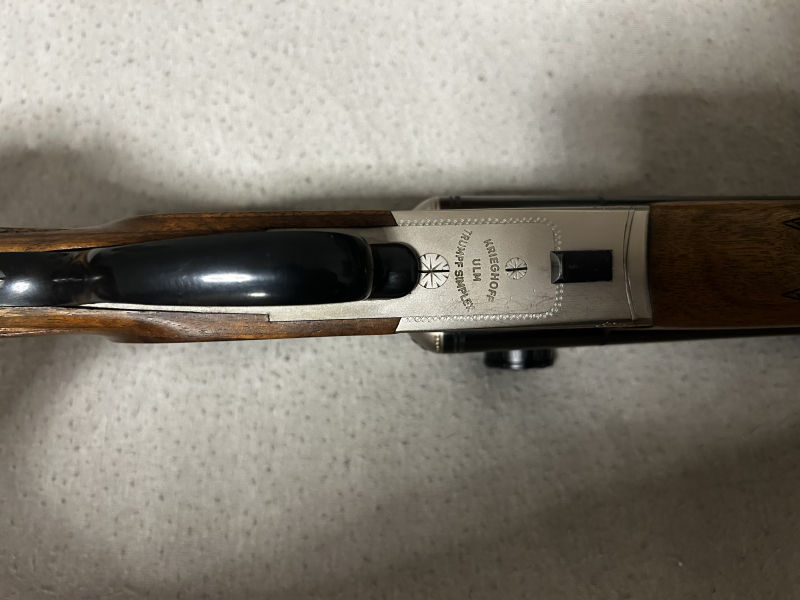 Krieghoff Trumpf Simplex mit separater Kugelspannung im Kaliber 20/70; 30-06, Einstecklauf im Kaliber 5, 6x50R und Zeiss Zielfernrohr mit Leuchtabsehen 3-12x56 und genug Platz am Objektiv für einen Adpater für Vorsatzgeräte, Schaft mit deutscher Backe und Gummikappe mit 35cm Länge, Lauflange 63,5cm Verkauf einer Gebrauchtwaffe, keine Garantie und Rücknahme.