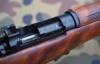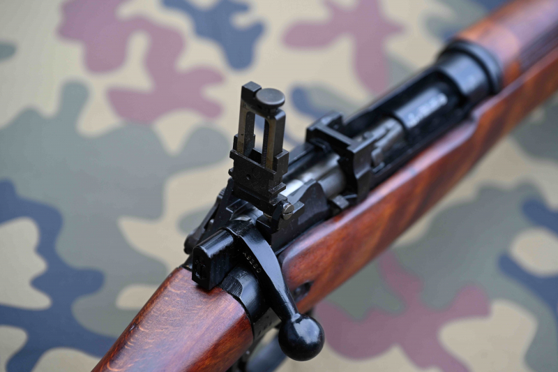 Seriennummer "A2980" auf Hülse und Schloß. Modellbezeichnung und Kaliberangabe ".22 No8MKI" und "D69" auf der Hülse links. Visierblatt skaliert bis "100", ganz oben "H" (= Vorhaltemarke für Flüchtigschießen).