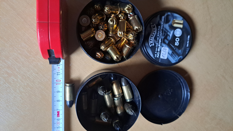 9mm R. K. / cal.9mm RB von Walther, Dose ist voll. Die Patronen der anderen Dose (12) haben den Bodenstempel DAG 76+78. länge siehe Bild. VERSANDKOSTEN INS AUSLAND BETRAGEN 60€