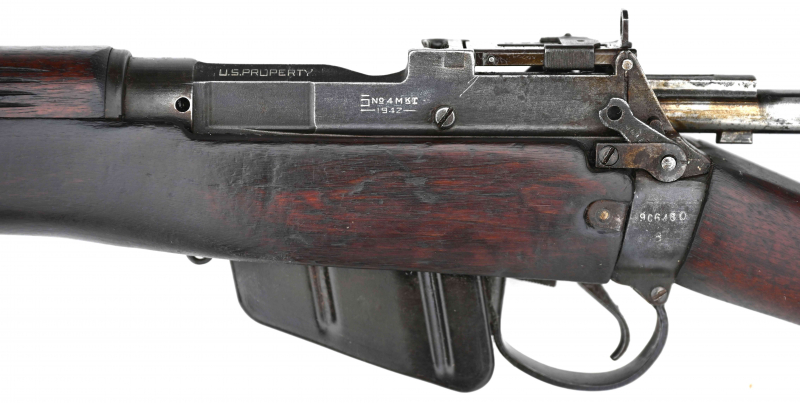 Diverse gültige britische Beschussstempel, Herstellerlogo „S“ und  Baujahr "1942" unterhalb der Modellbezeichnung "No. 4 Mk I" linksseitig auf der Hülse. Auf dem Schaftring links sowie auf dem Kammerstengel und auf der Magazinunterseite Seriennummer "9C6480". Eigentumsstempel "U.S.PROPERTY" auf der Hülse links, hinweisend auf das damalige  Lend-Lease-Projekt der Leihwaffen an England im Krieg.