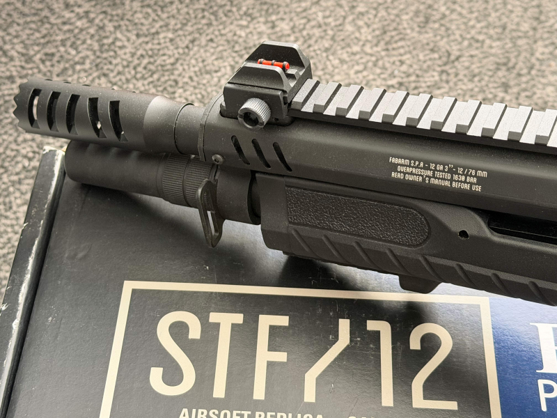 Der vordere Teile der Shotgun ist bis auf den Spannhebel an der Unterseite komplett aus stabilem Metall gefertigt. Außenlauf und auch das untere dekorative Laufsystem bestehen daher komplett aus detailliert gefertigtem Aluminium und sind mit einer schwarzen Beschichtung versehen. Auffällig ist auch der Flash-Hider im besonders aggressiven Design. Dank der Lizenzierung befinden sich auf der Abdeckung über dem Außenlauf originalgetreue, eingelaserte Fabarm-Markings. Oben ist eine durchgehende 21 mm Zielgerätschiene angebracht. Diese ist im vorderen Bereich mit einer Fiber-Optik Visierung ausgestattet, die wahlweise auch abgenommen werden kann. Im unteren Bereich befindet sich der taktische Spannhebel bzw. Spanngriff, welcher aus robustem Polymer-Verbundkunststoff gefertigt ist. Durch die ergonomische Formgebung mit eingearbeiteten Rillen und Strukturierungen ist für einen sehr guten Halt gesorgt. Unten am Spanngriff befindet sich zusätzlich noch eine praktische 21 mm Schiene. Das komplette Frontsystem kommt natürlich in der bekannten und besonders präzisen VFC Fertigungsqualität.