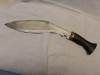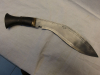 Original Gurkha Khukri, kein Nachbau. Gesamtlänge ca. 37 cm, Klingenlänge ca. 27 cm, Klingenstärke an der dicksten Stelle des Klingenrückens ca. 8 mm. Klingenbreite an der breitesten Stelle ca. 6 cm. Die Klinge ist blank, der Griff hat auf der rechten Seite einen Riss.