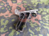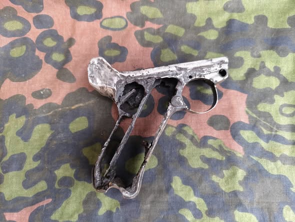 Zum Verkauf steht ein originaler P08 Luger Rahmen, als Bodenfund aus dem Zweiten Weltkrieg. Das Teil wurde eindeutig aus der Erde geborgen und ist stark beschädigt, teils abgeschliffen bzw. ausgeschnitten, wie auf den Fotos zu sehen ist.