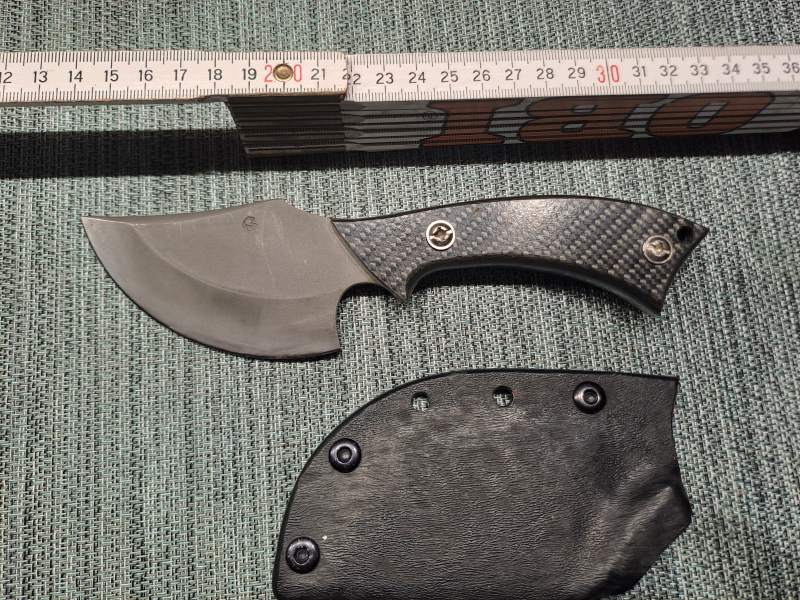 Handgefertigten Slinner. Carbonscales, Kydecscheide. Ich kann dem Schlagstempel der Messermachers nich nicht zuordnen.
