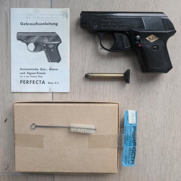 Eine hochwertige Taschenpistole im preisgünstigen Kaliber 6mm Platz, die Waffe verfügt über die PTB 165. Die Perfecta befindet in einem guten und natürlich voll funktionsfähigem Zustand. Mit dieser Pistole kann Knall- und Gasmunition verschossen werden, ein Abschlussbecher für Signalmunition ist bereits in der Waffe integriert. Die Pistole wurde von mir zur Probe mit zwei Schüssen getestet. Alles einwandfrei. Danach habe ich die Waffe ordentlich gereinigt.